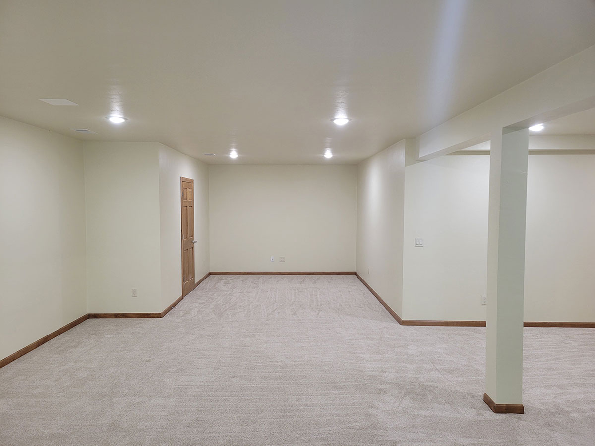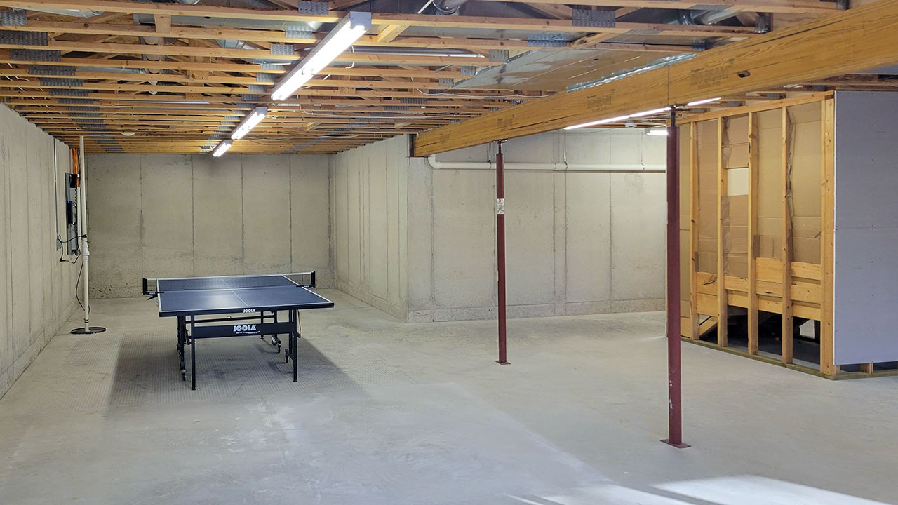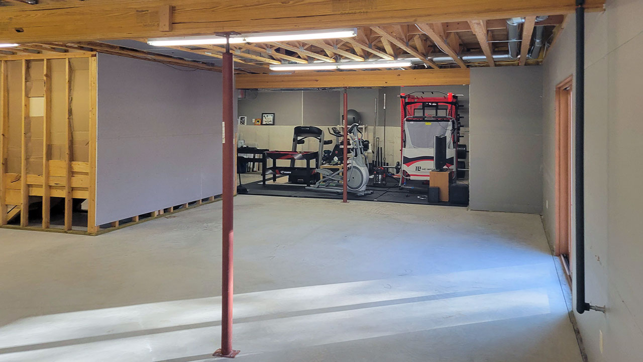 - Frame and sheetrock walls for full bathroom, storage area, drop soffits, and new wall at exercise room