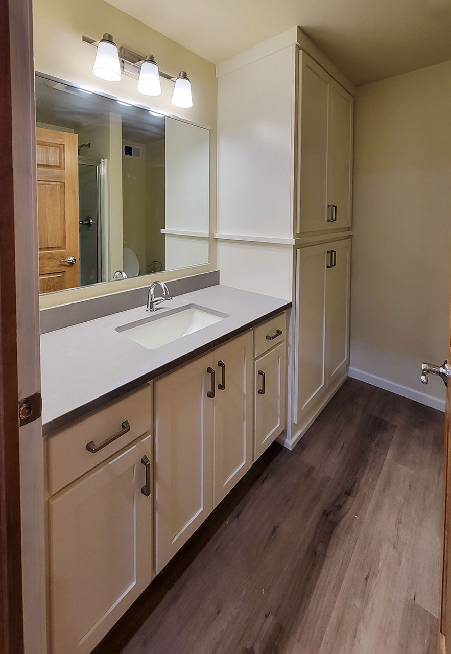- Full bathroom has shower insert with glass door and polished chrome finish, custom vanity with quartz countertop and undermount sink, tall linen cabinet, luxury vinyl plank flooring