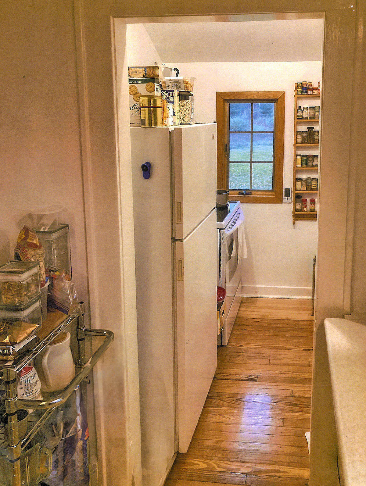 - The side room was converted into a walk-in pantry with custom shelving and tall pantry cabinet