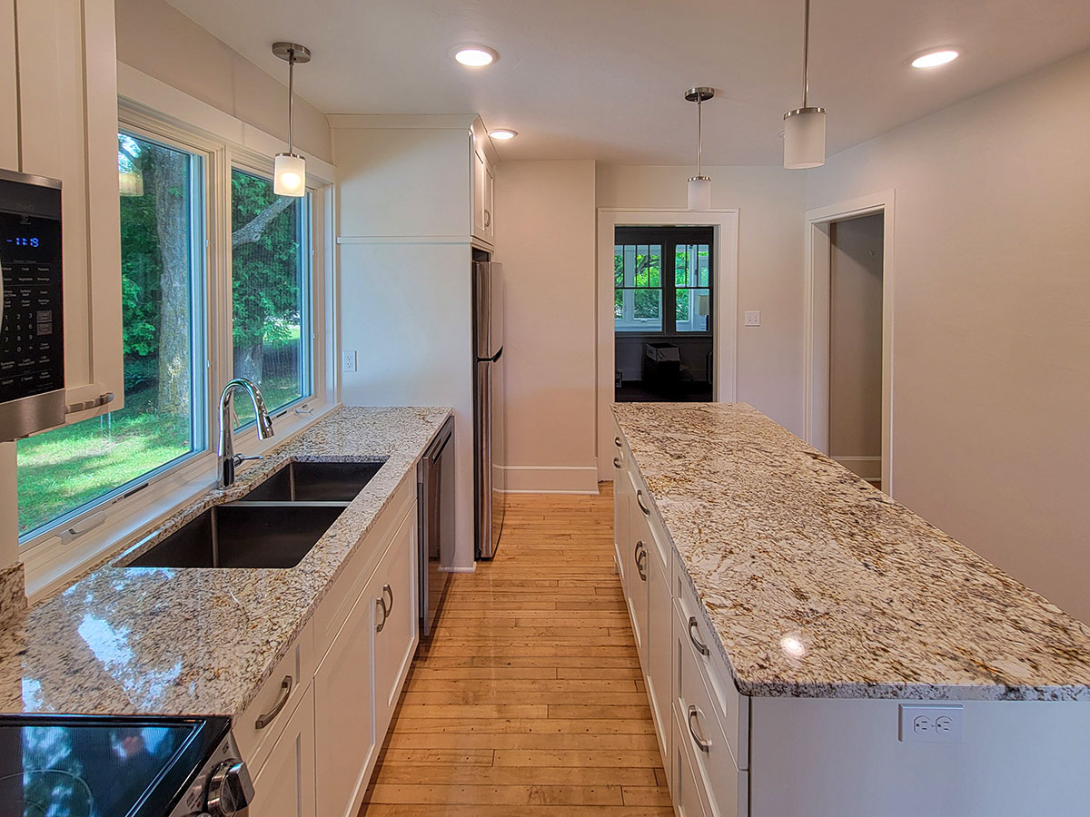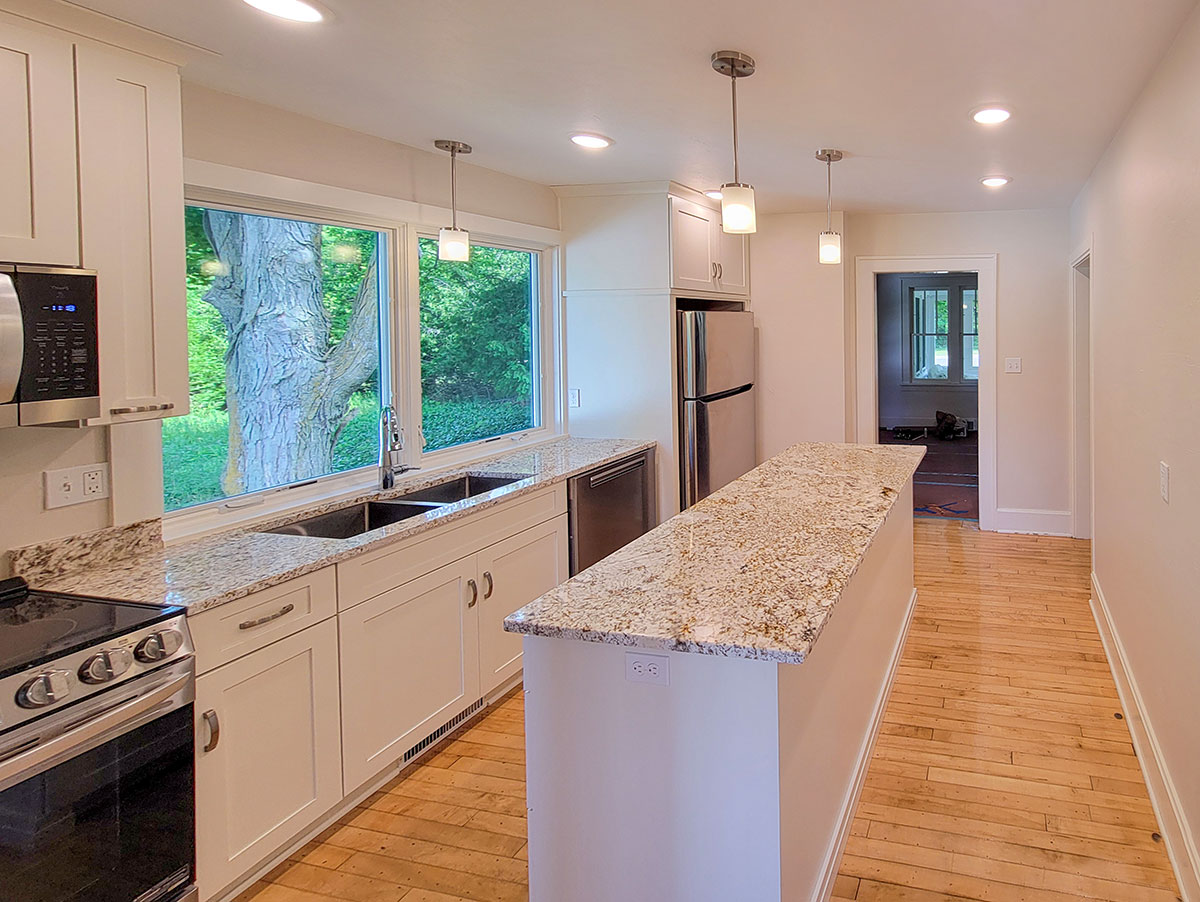 - New kitchen layout has more efficient flow with stove, sink, dishwasher and refrigerator all in the main part of the kitchen