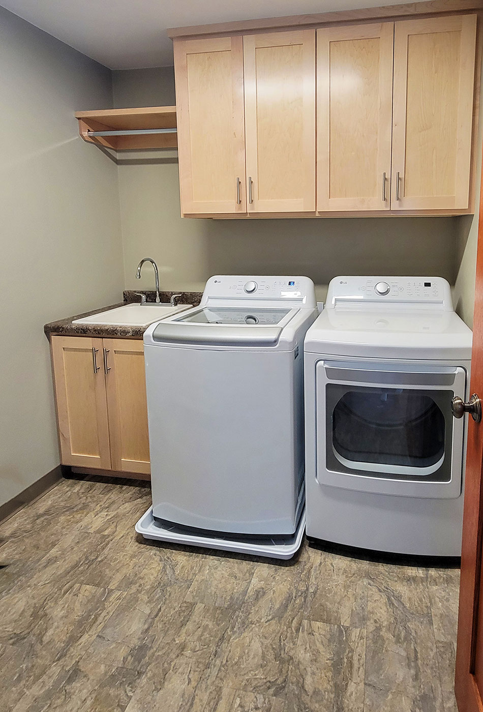 Dedicated laundry room with Mustee drop in utility sink, and maple upper cabinets