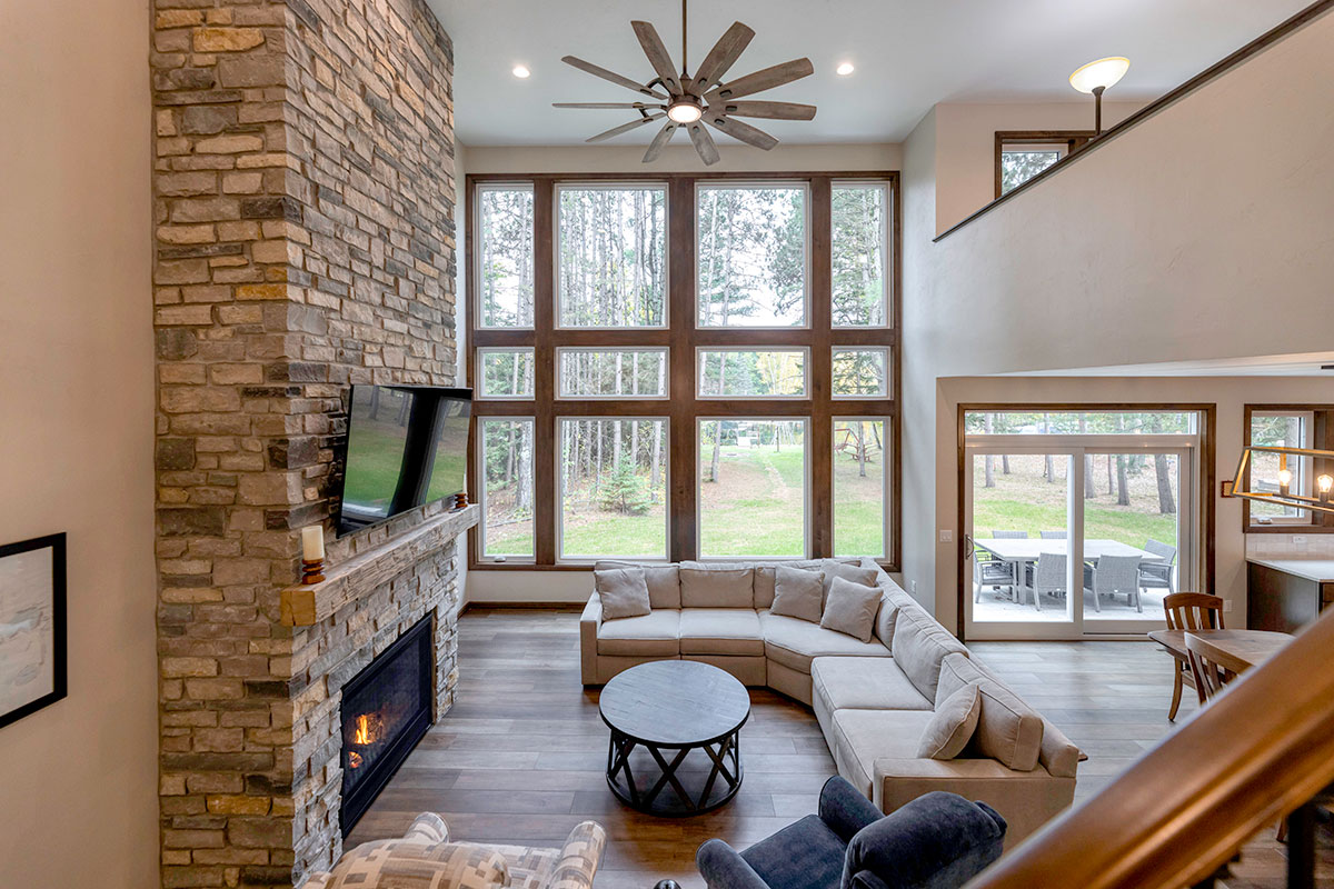 - Living room has cathedral ceiling with impressive floor to ceiling windows providing lots of natural light and beautiful views of the pine-wooded lot leading to the lake. A gas fireplace features Thin Cut Stone face in Halquist Manchester extending to the ceiling, and a barn beam mantel.