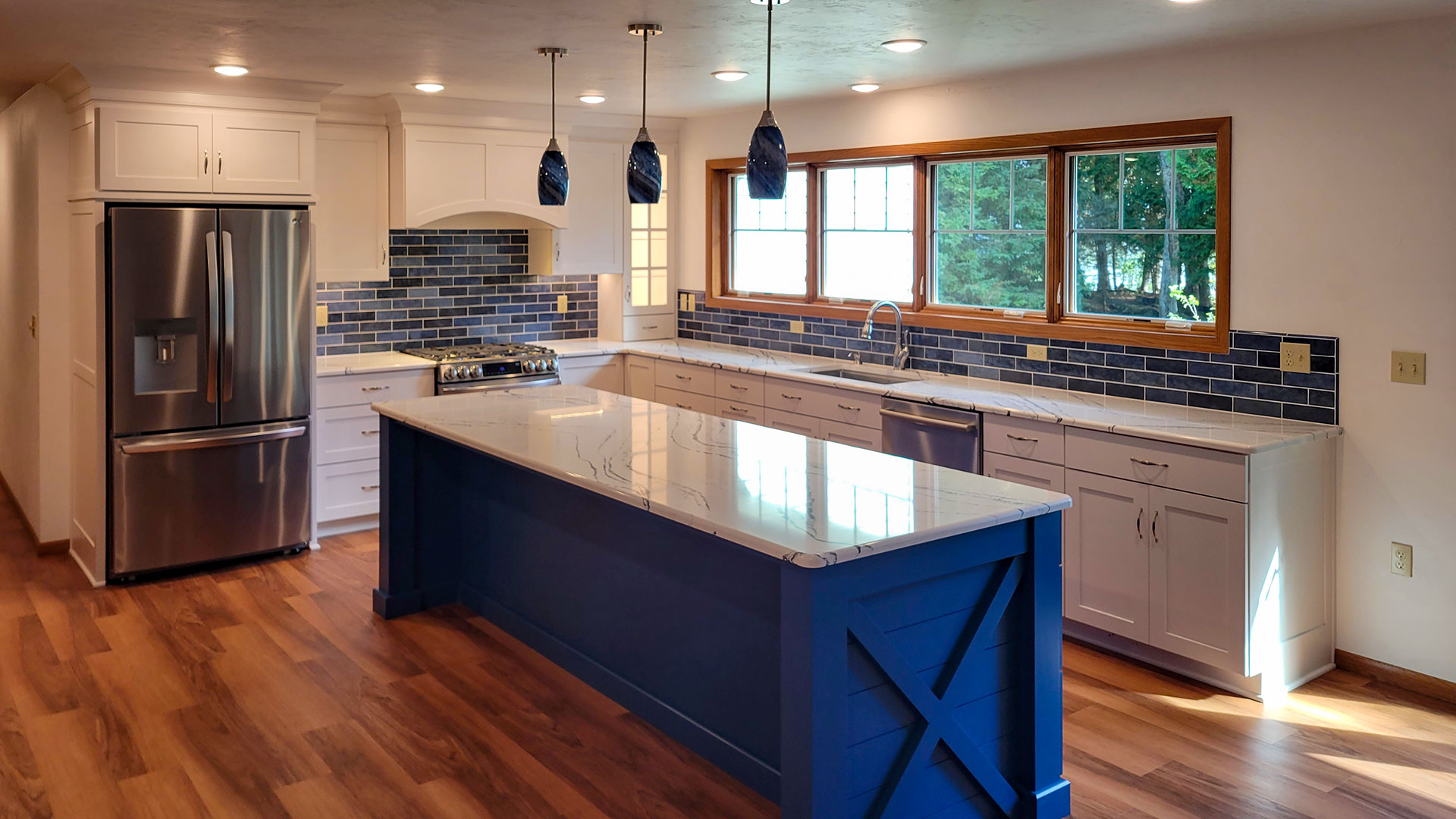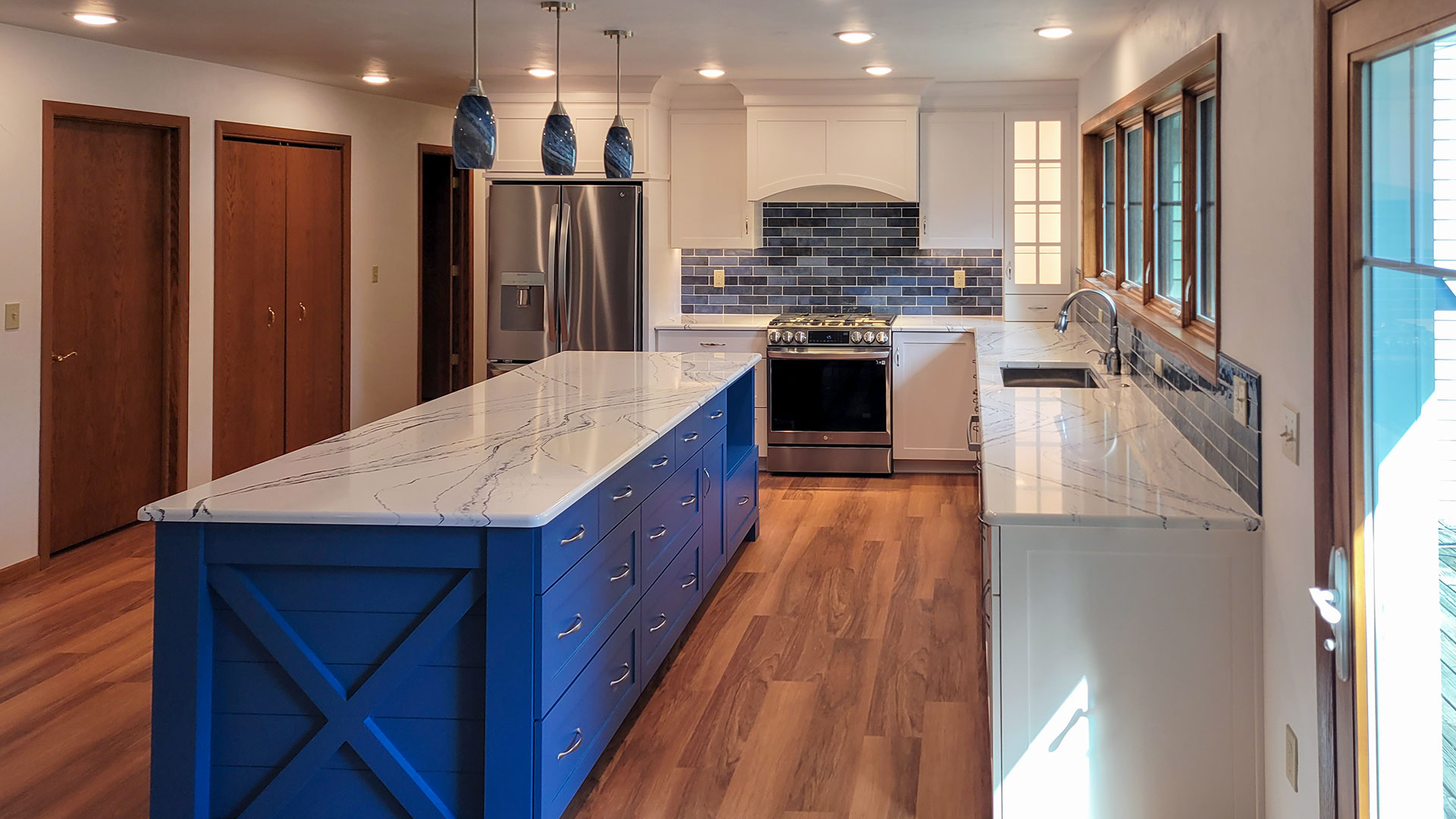 - Accent island in cobalt blue with extended snack counter and pull-out storage drawers