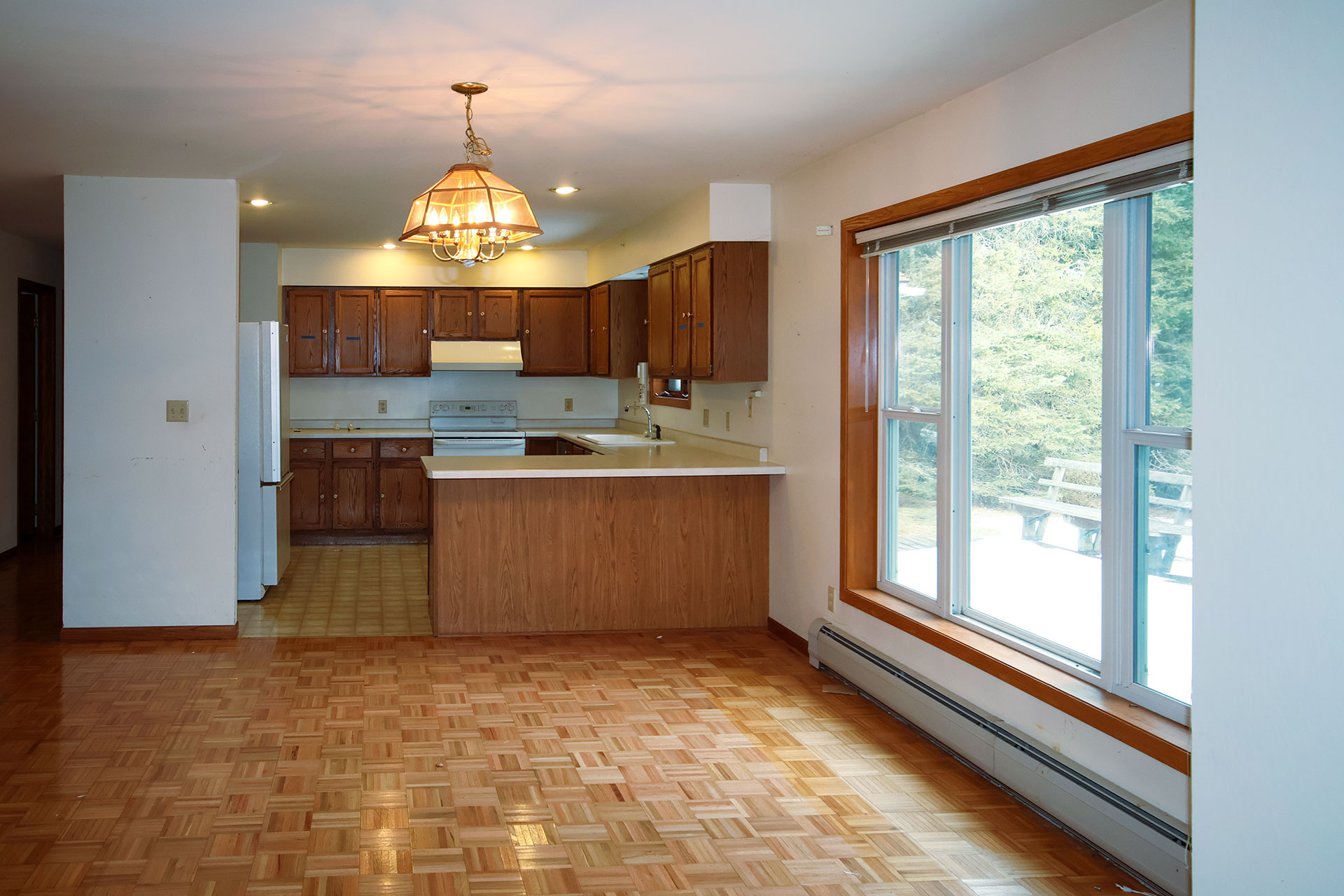 - Removed all kitchen cabinets, soffits, and interior walls and windows at kitchen and dining area