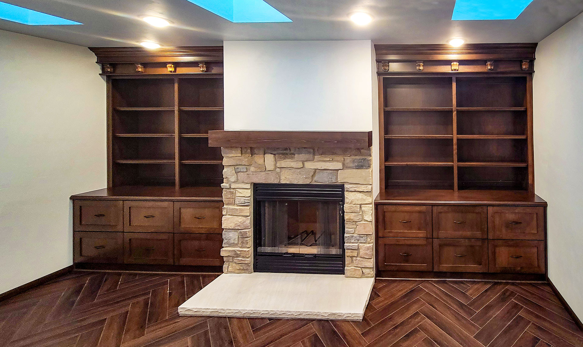 - Library with gas fireplace with Cultured Stone face, cut stone hearth, and stained box mantle, flanked by custom-built base cabinets with file drawers and bookshelf uppers, Luxury Vinyl Plank flooring