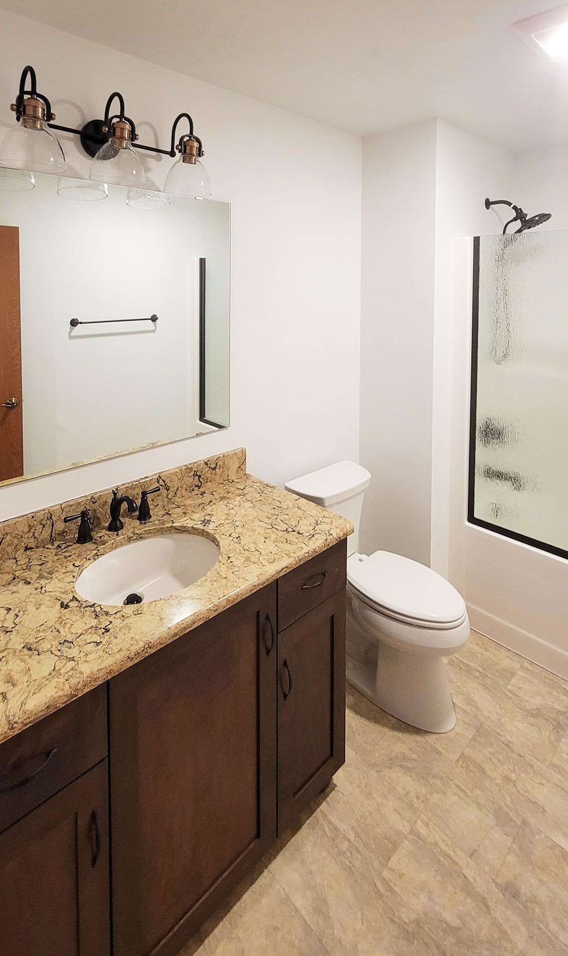- A full bathroom with shower and tub insert, a custom vanity with quartz countertop, and ceramic tile flooring