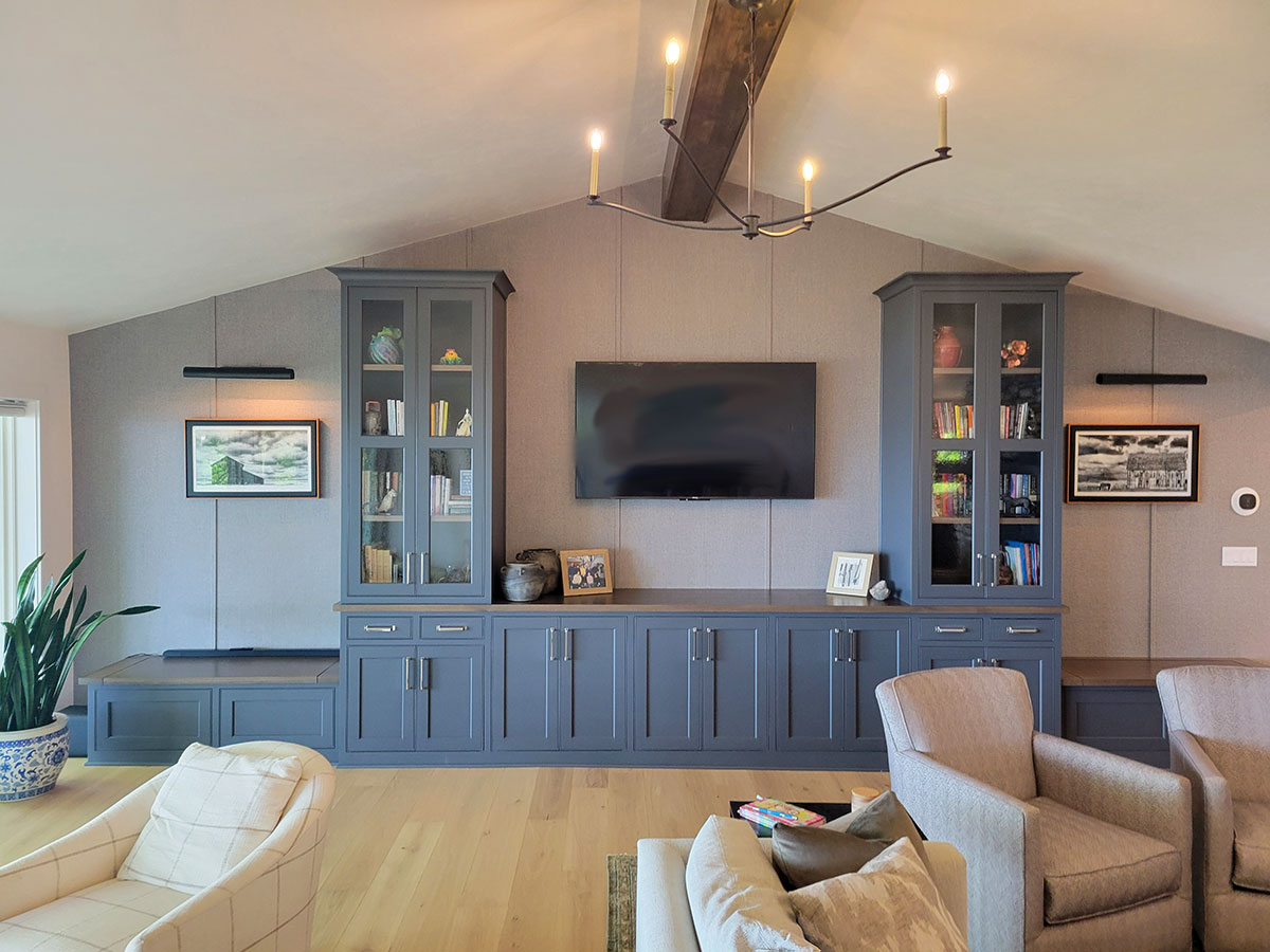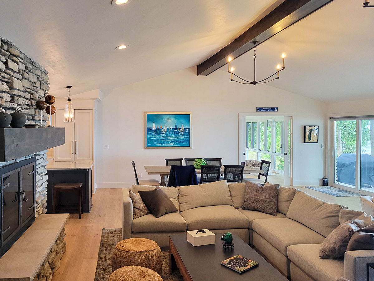 • The living room features custom-built painted maple cabinetry, including two display cabinets and two storage benches with seating. All countertops are maple wood. A new wood-stained ceiling beam was installed, and the existing fireplace mantel was wrapped with stained knotty alder wood. A new hearth was installed to match the existing fireplace face.