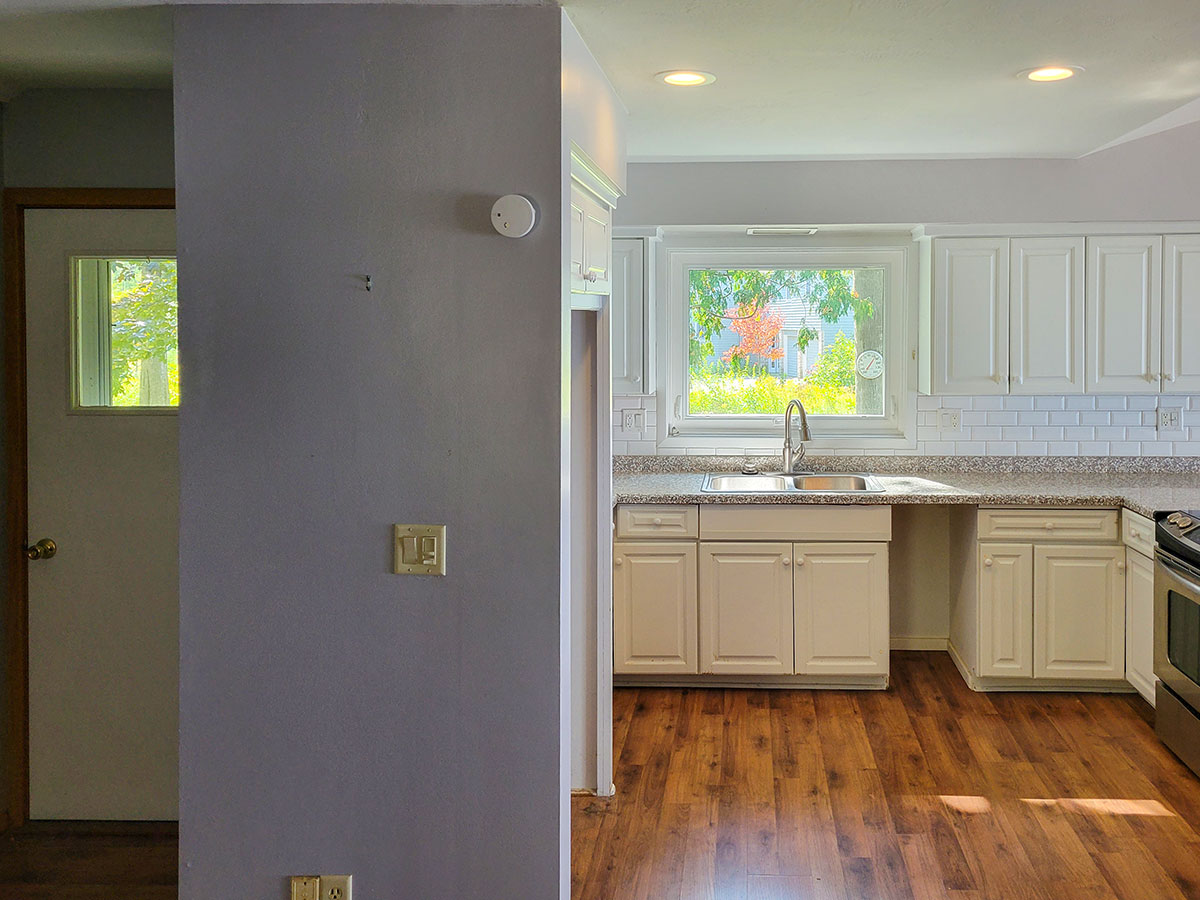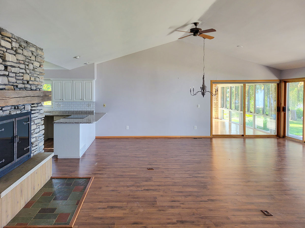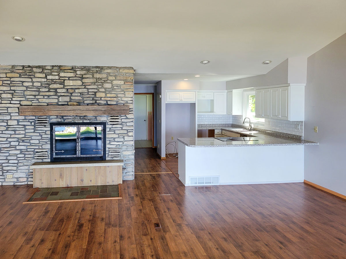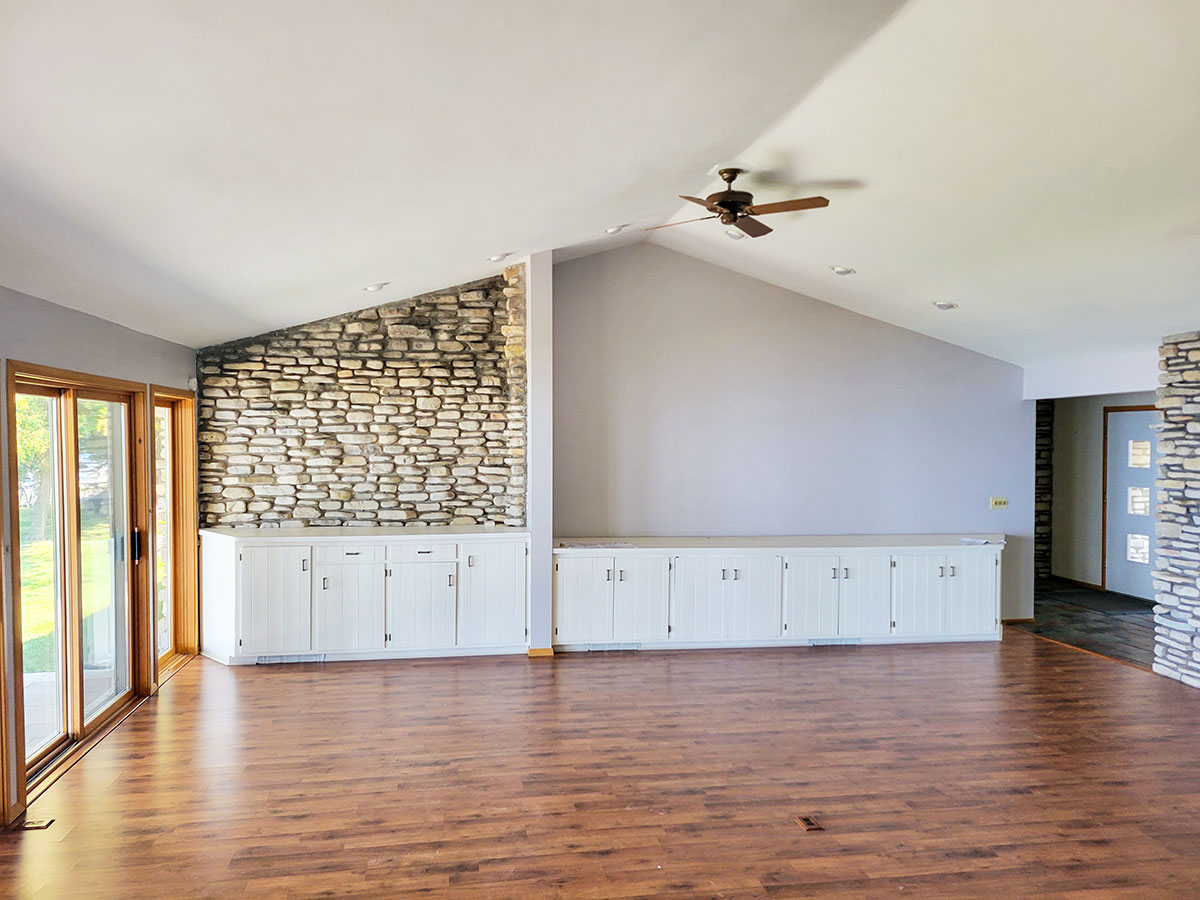 • Removed all cabinetry and drop soffits in the kitchen and living room.