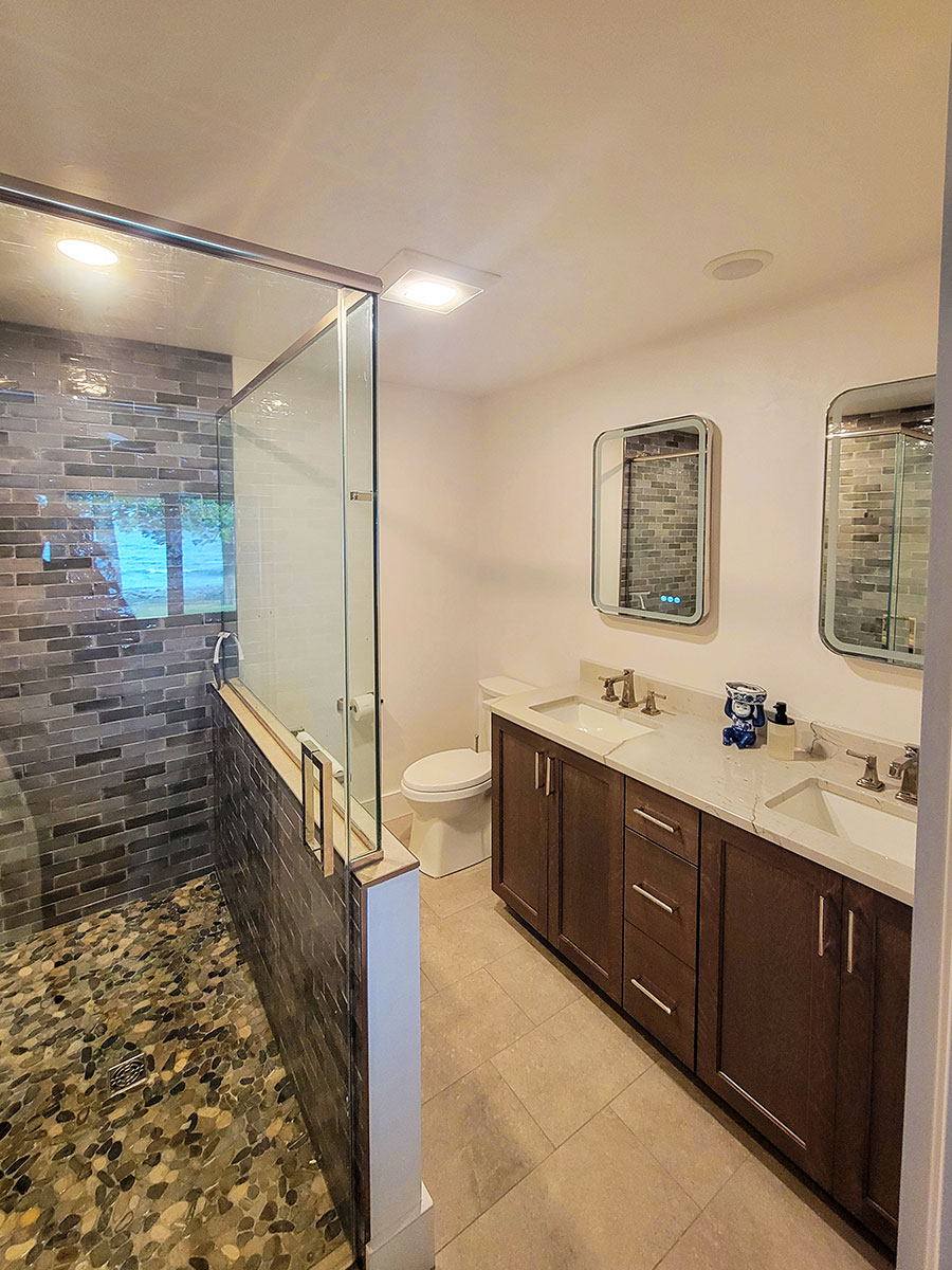 • The primary bathroom features a custom-tiled walk-in shower, a custom vanity with a granite countertop and dual sinks, and ceramic tile floors.
